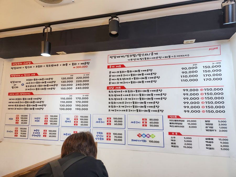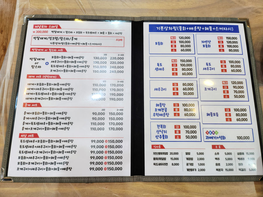 홍게 세트, 독도 생새우 세트, 모둠회, 조개구로 나뉜다.