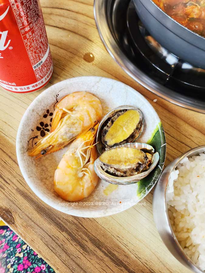 전복 뚝배기 안에는 새우 두 마리, 전복 두 마리.