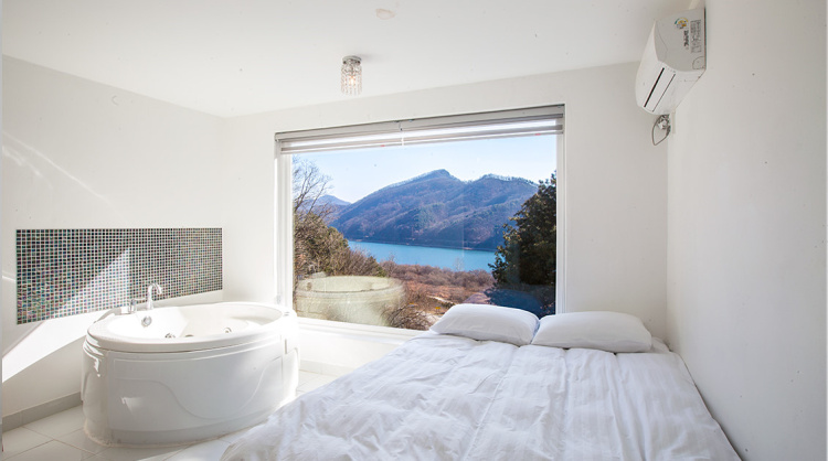 북한강의 호수 뷰를 통창으로 볼 수 있는 춘천의 피그멜리온 이펙트 펜션. 객실 사진을 보니 침실 옆에 스파가 있고 통유리창이 있어서 뭔가 사진은 엄청나게 예쁘지만 아마도 현실은 스파하고 나면 침실에 어마어마한 습기를 감당하지 못할 것 같기도(...)